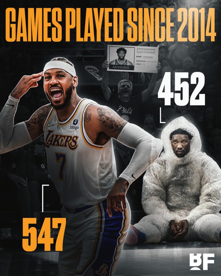 Embid đã tham gia giải đấu trong 14, và Anthony đã chơi 547 trận và Embiid đã chơi 452 trận. Điều đáng nói là Anthony đã nghỉ hưu vào năm 2023.