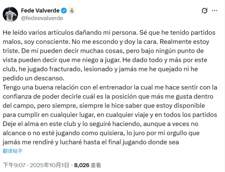 Valverde được đăng trên phương tiện truyền thông xã hội, trả lời các báo cáo phương tiện trước đó rằng anh ta từ chối chơi. Anh ấy nói rằng anh ấy có một mối quan hệ tốt với huấn luyện viên và sẵn sàng tặng mọi thứ cho Real Madrid.