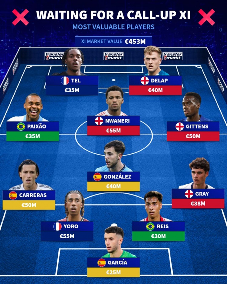 Không có tên trong đội hình giá trị nhất của đội tuyển quốc gia (tổng giá 453 triệu euro, nghĩa là chưa bao giờ được chọn vào đội tuyển quốc gia)